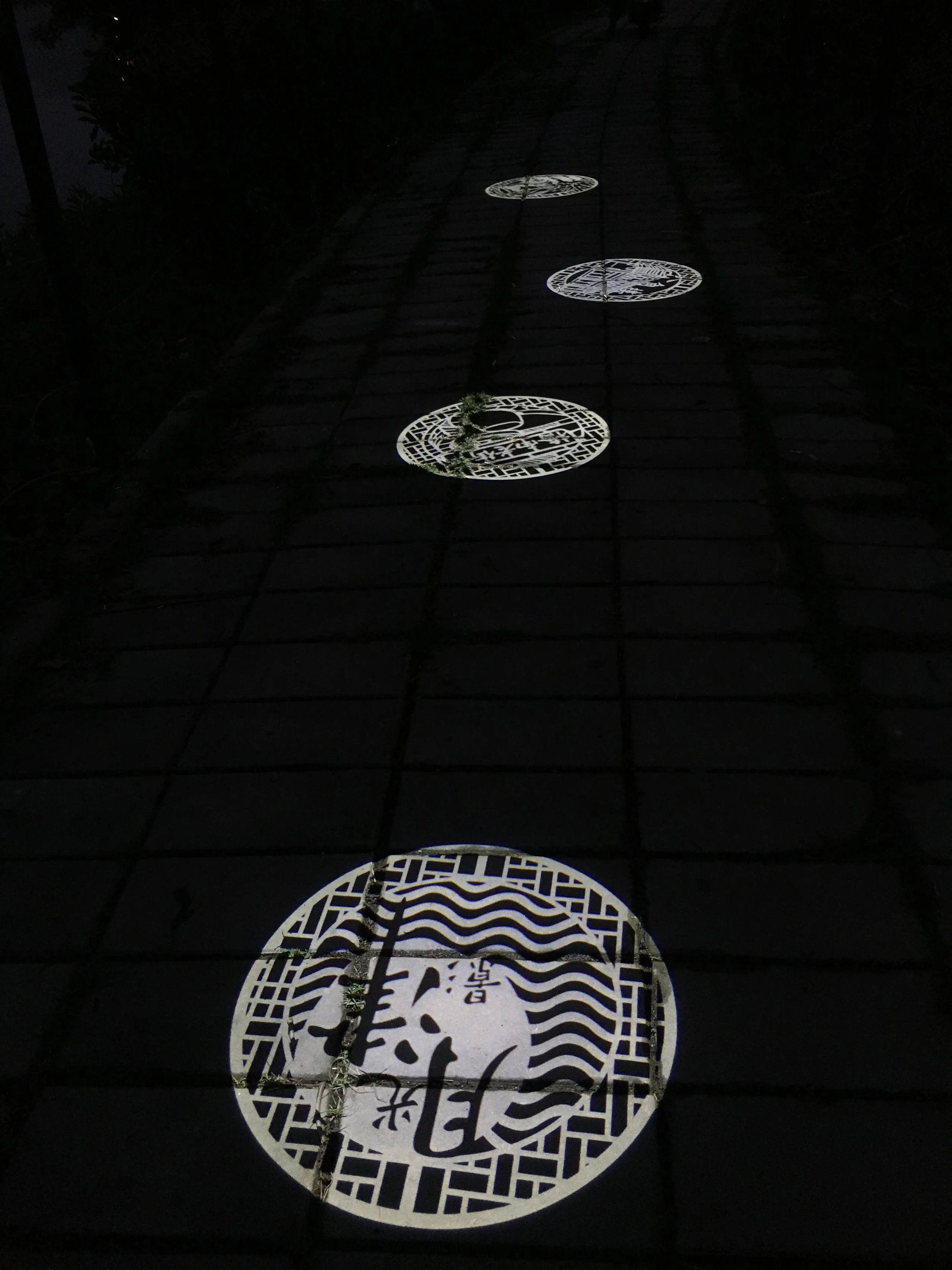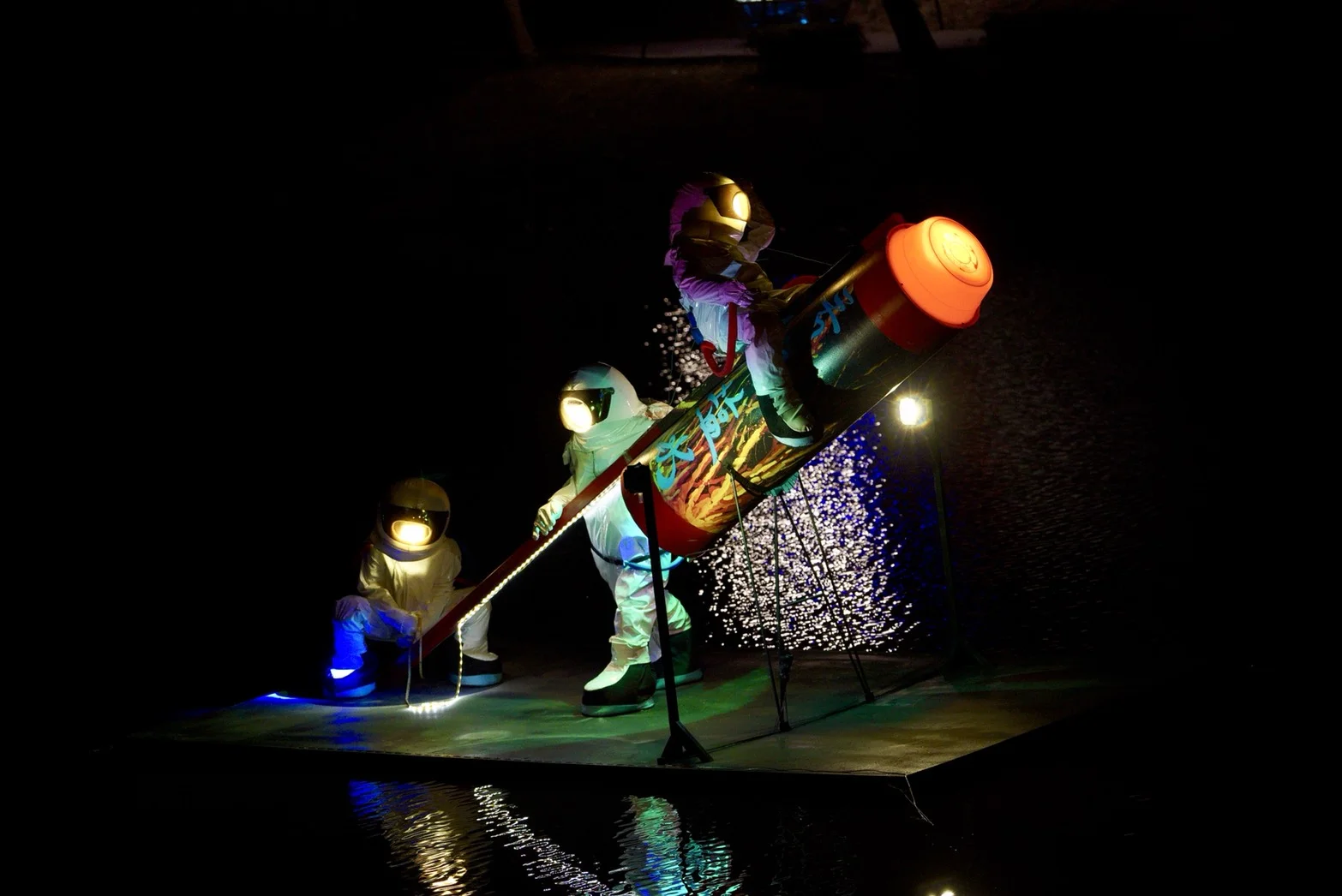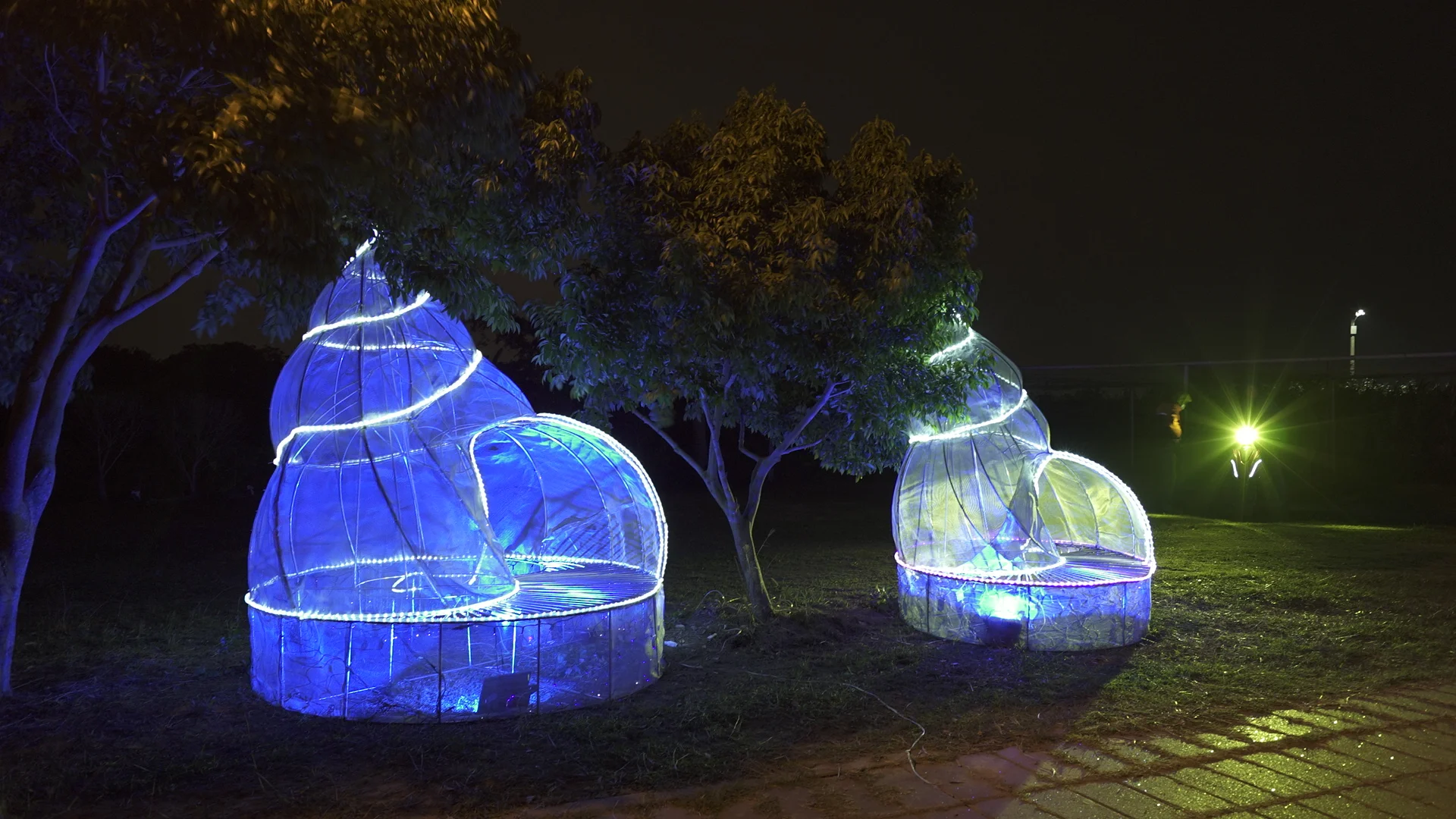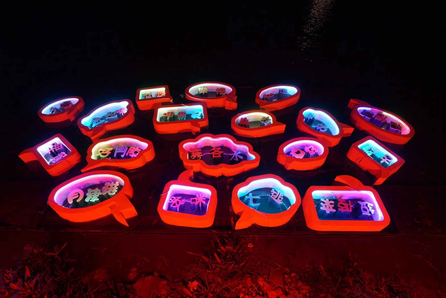 月光光果實,吸收月光與月津港水面蒸霞之氣孕育而成。在節氣之時,結實累累、藍綠相間、光滑隱透於表面,散發瑩火於夜間,隨月津水岸錯落而生,隨風搖擺,隨水浮動。「易冶設計」在水域邊,設置了多件造型和色彩各異的燈光裝置,這些耐人尋味的奇特造型,在夜色中兀自發光,彷彿是來自其他星球的果實——藝術家的豐富想像力,與月津港特有的在地景致並置融合,共同創造出全新的空間感受。