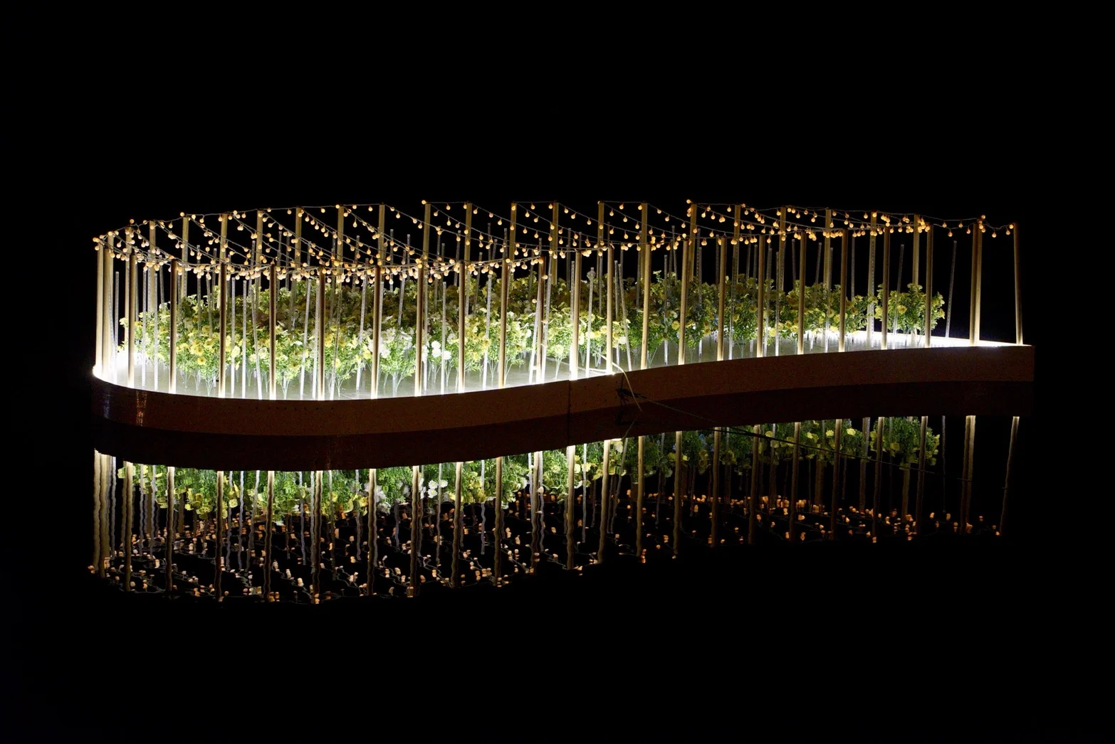 Drawing on the concepts of environmental protection and sustainability, Xiao-Meng Su, an artist who has long dedicated to metalwork, made clever use of intertwined plastic tubes and light to create Light Cloud, a cloud- or flower-like white installation floating on the surface of the water. Its reflection appears on the calm waters near the twisting bridge. Such an unrealistic rosy view allows the visitors, be they old friends who made appointments to meet here or new acquaintances who have chance encounters, to take in this romantic, gorgeous scenery from an elevated position and ergo to gain a strong visual impression as to the charm of this work.