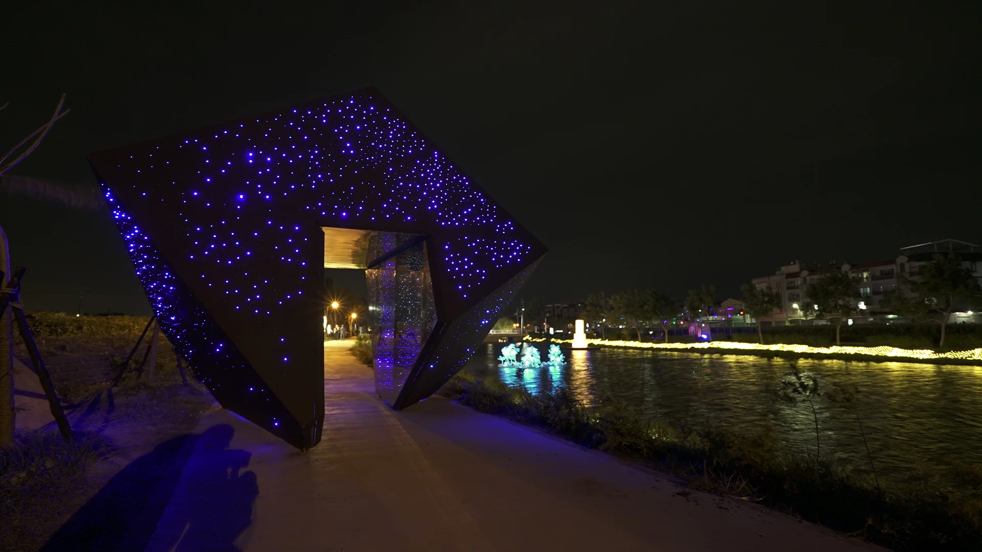 Light is a symbol of imagination. Knitting Light is designed to weave threads of light and let them dance on the twisting bridge where the shuttling visitors encounter the dancing light. The artists used bendable light strips to create rhythmically flowing illuminations on both sides of the bridge, thereby immersing the visitors in the field comprising lines and planes of light. When the visitors gaze into the twisting bridge at a distance in the twilight, they will come across the radiance of the fantastic light-scape and become enchanted by the romantic, mesmeric visual effect of this work.