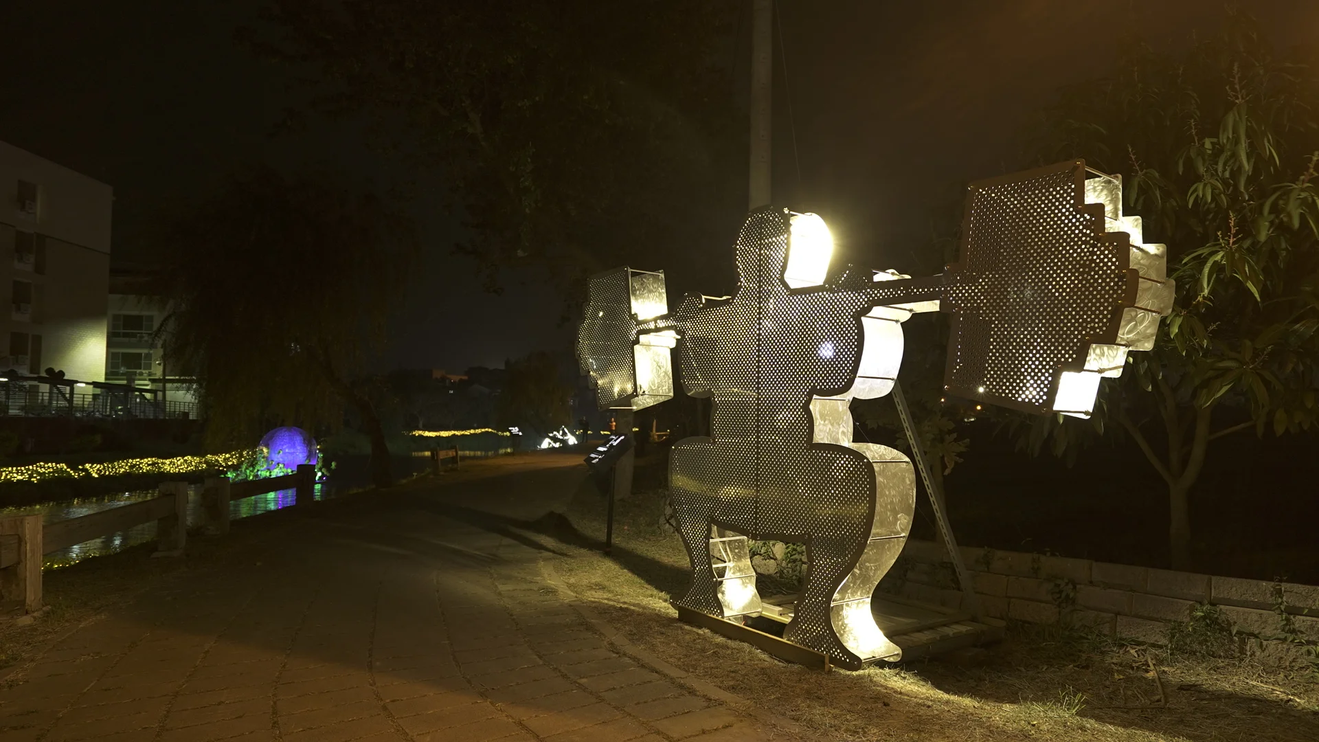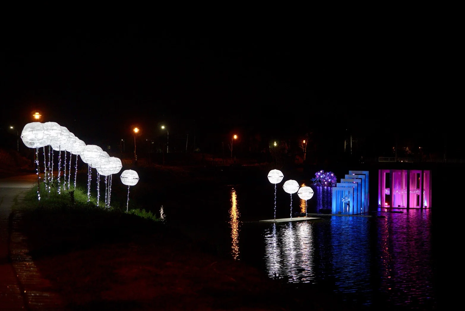 長期專注於金工創作的藝術家蘇小夢,以以環保再生概念為基礎,利用纏繞的塑料長管和燈光,製作成漂浮在水面的白色造型——有如雲朵或花卉的〈光雲〉,在靠近曲橋的河中映射出自己的倒影,鏡花水月的詩意風景,讓每位相約在此的舊識,或是相逢邂逅的新知,都能眺望到這片浪漫美麗的光影風景,並在記憶中留下深刻的視覺印象。