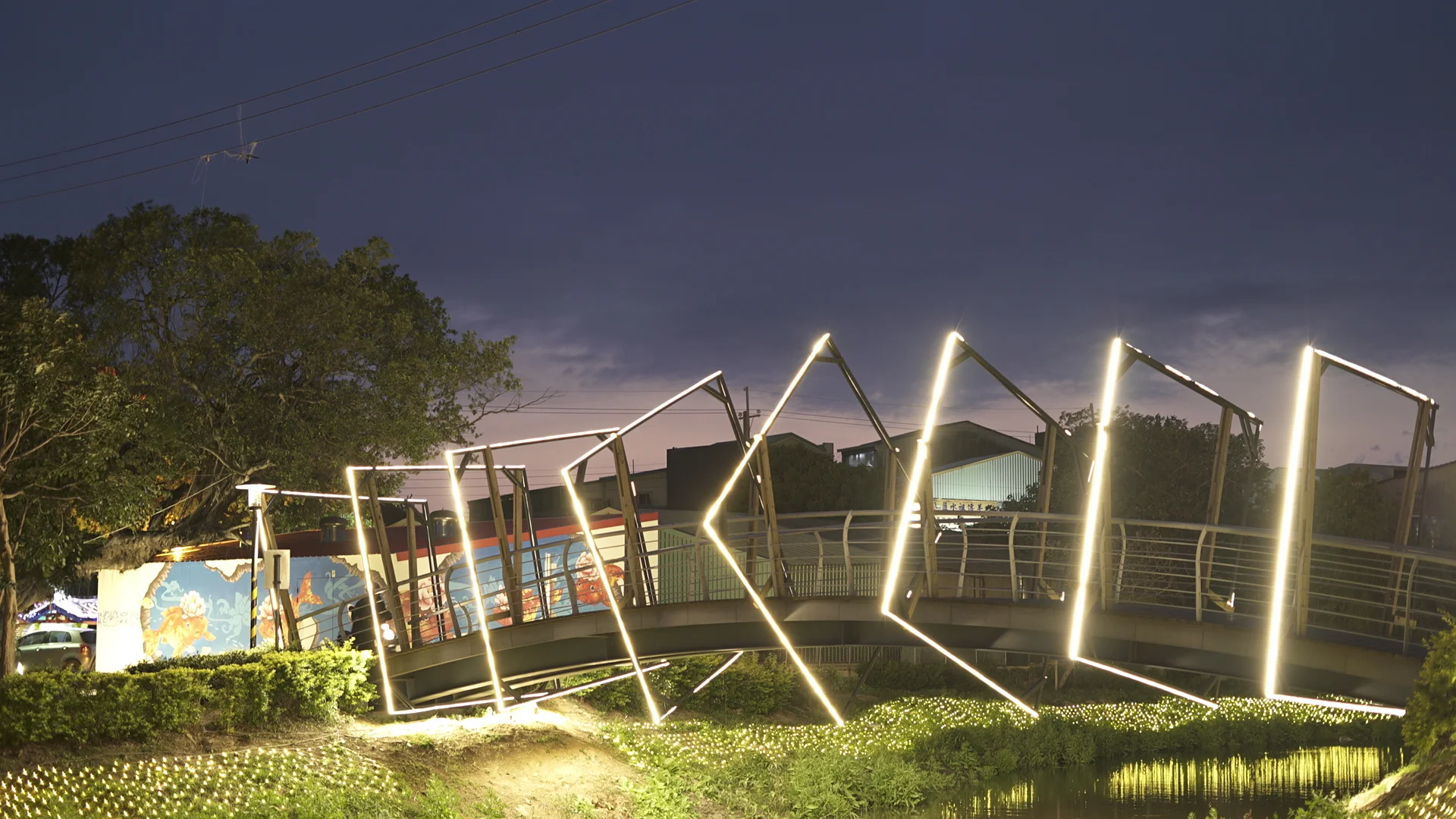 光是想像的一種代名詞。〈光的織遇〉試圖讓光編織出軌跡,舞動在曲折的橋上,讓來來往往的人們與光相會。作品利用軟性可曲折的環光燈條,編織出光的流動身影,定格出律動的光線,交織在曲橋的兩側;置身其中,能夠感受到由光的線與面所構成的光織場域。當夜色降臨,人們遠眺曲橋時,光線將織譜出視覺的浪漫樂章,與觀者相約在夢幻的光景中。